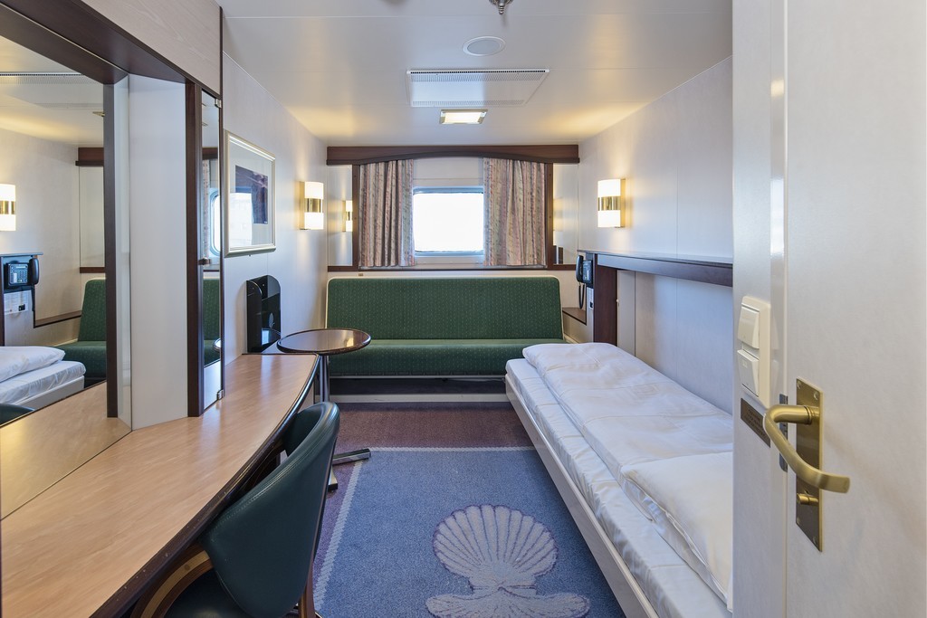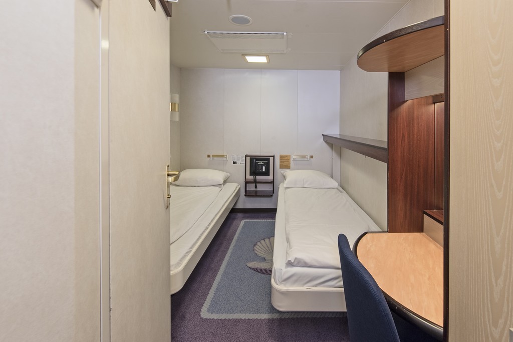 These standard outside cabins for up to three people on the middle decks have bunk beds and separate beds, one of which converts into a sofa, and bathrooms with shower/WC.
