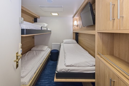 Our Polar outside cabins are situated mostly on the middle or lower decks and all have bathrooms with shower/WC. These standard outside cabins for up to three people on the middle decks have bunk beds and separate beds, one of which converts into a sofa, and bathrooms with shower/WC.